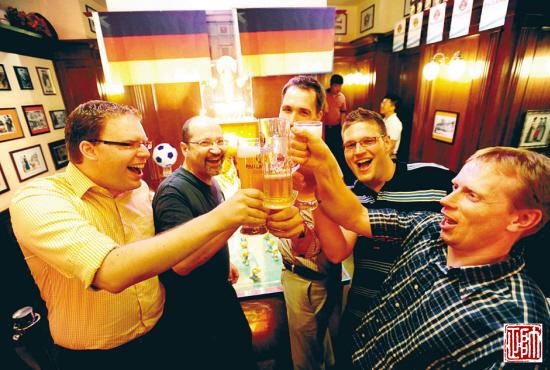 德国友人在凯宾斯基饭店普拉那啤酒屋里举杯欢聚。